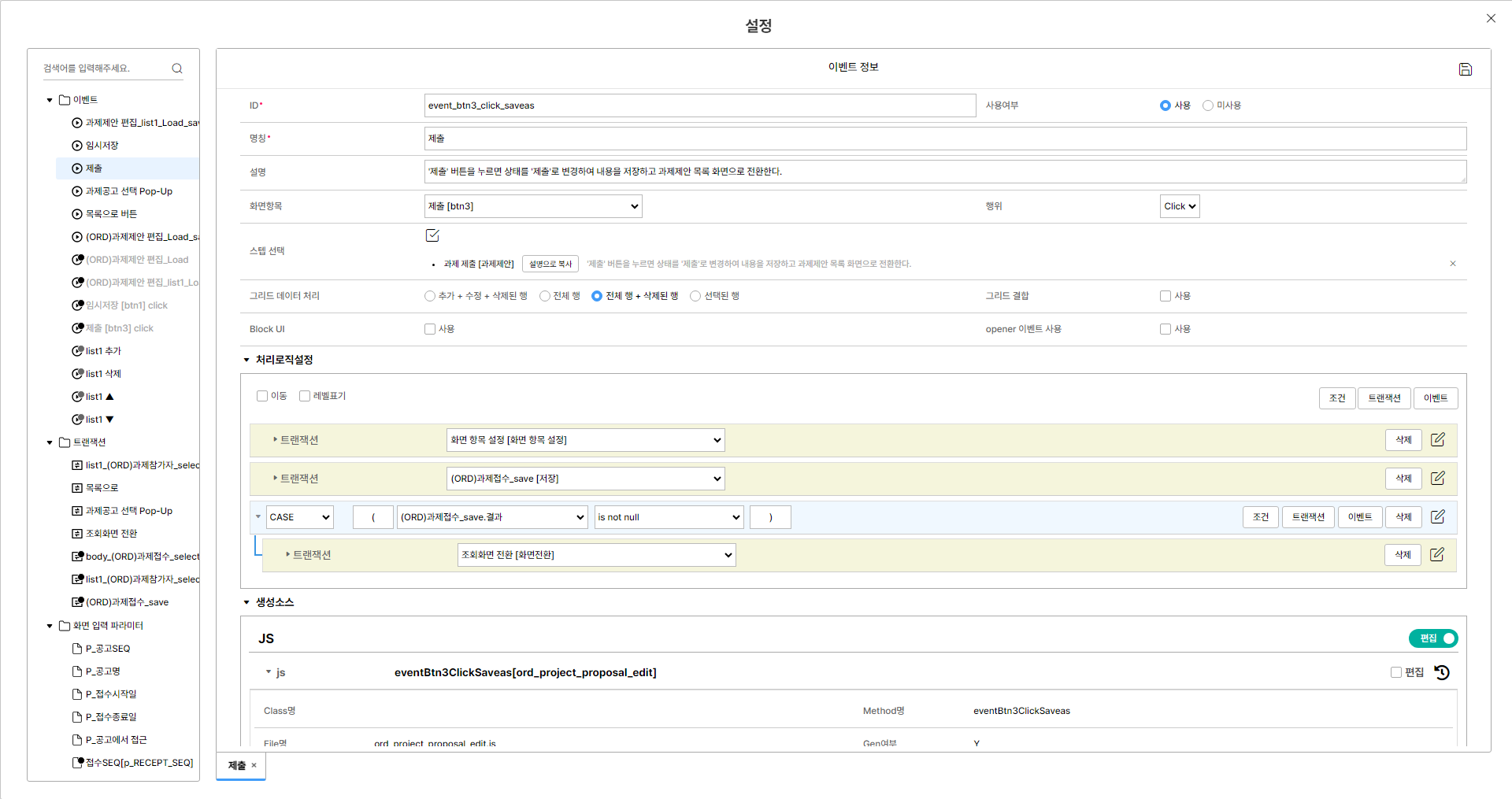 화면의 클릭, Data Loading, On-change 등의 Event를 정의하는 기능으로 화면설계 결과에 따라 자동 생성되는 Event와 사용자 정의 Event로 구분되며, 처리 로직은 Block Code 형식으로 설정이 가능하여 조건식과 Transaction의 입출력 정보 그리고 Customizing 내용을 정의합니다.